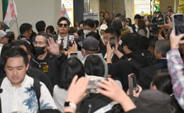 阪神がキャンプ地の沖縄入り 佐藤輝明の姿にファン大興奮 警備員から「押さないで」の声も響く