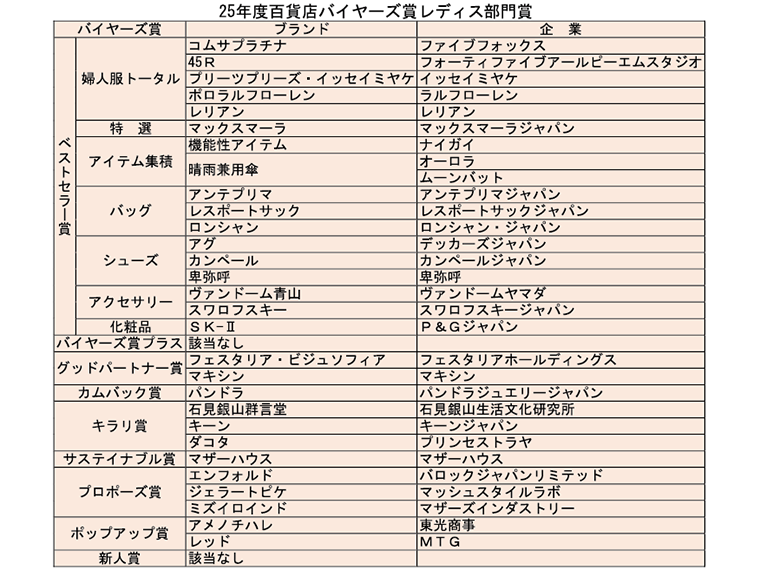 繊研新聞社主催「25年度百貨店バイヤーズ賞」レディス部門 30ブランドが受賞