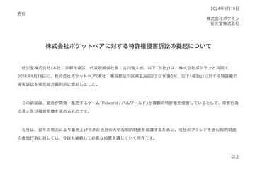 任天堂&ポケモン「パルワールド」販売のポケットペア提訴「侵害行為の差止及び損害賠償を求める」