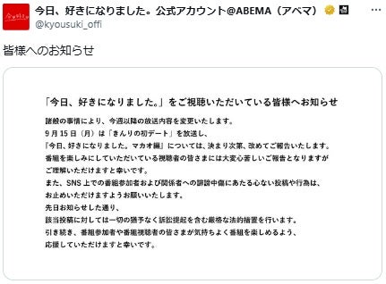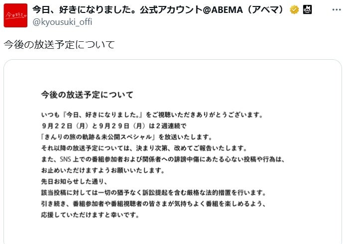 「今日好き」重大な違法行為に注意喚起 悪質な動画投稿・参加者への誹謗中傷に対して「法的措置を視野に入れた対応を進めており」