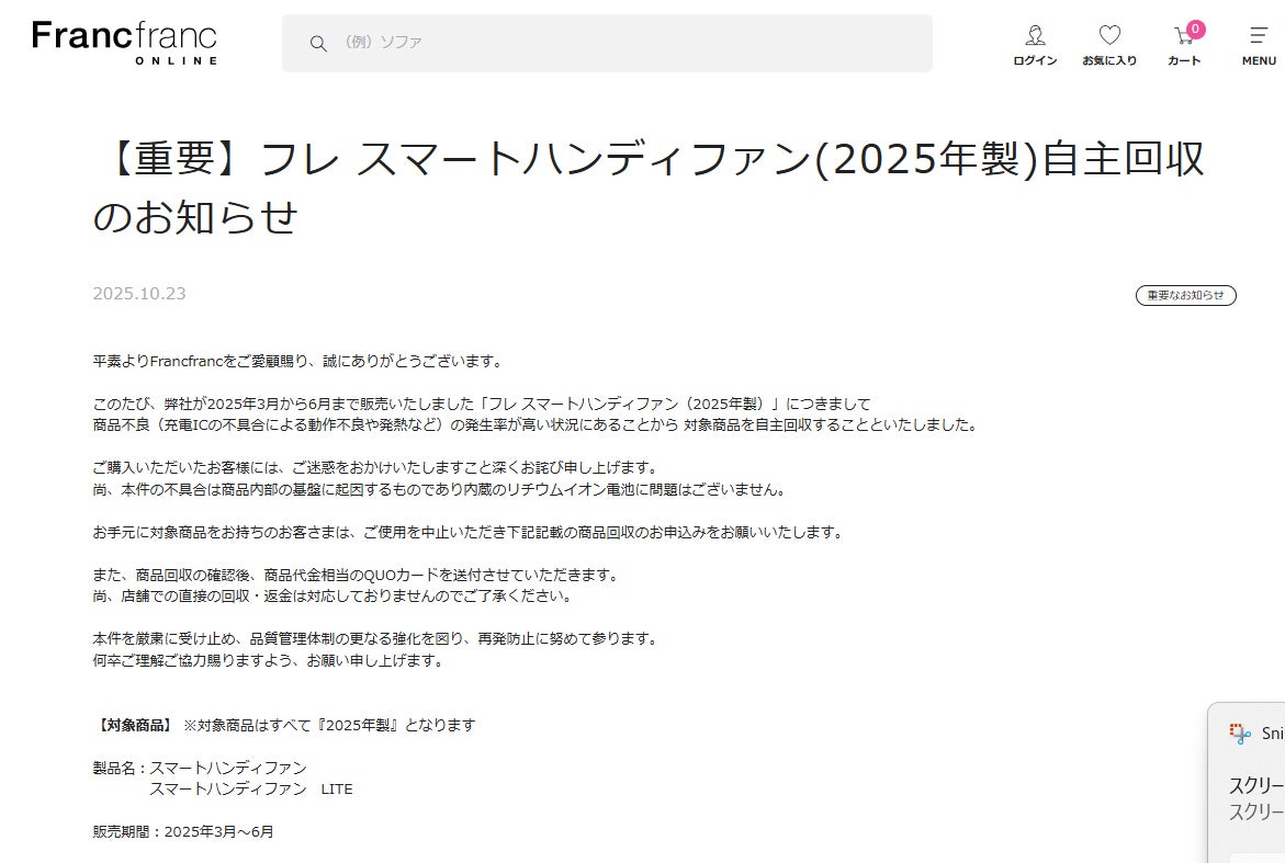 Francfranc「ハンディファン」自主回収を発表 2025年製“フレ スマートハンディファン”「動作不良や発熱などの発生率が高い」