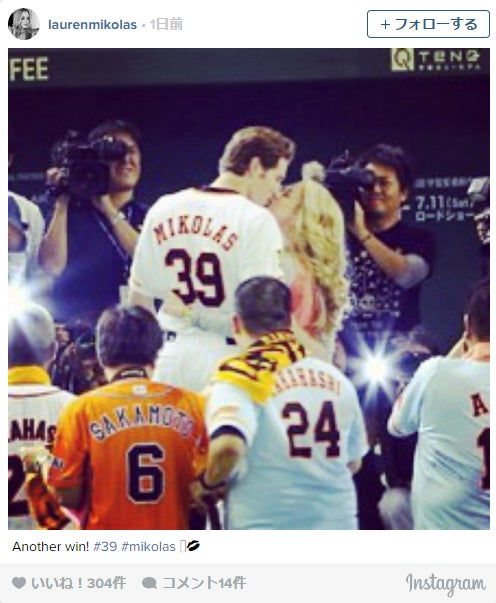 勝利のキス連発!美人すぎる巨人マイコラス投手妻が抱擁祝福