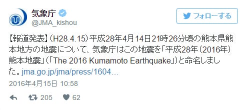 気象庁「平成28年熊本地震」と命名 熊本県で最大震度7