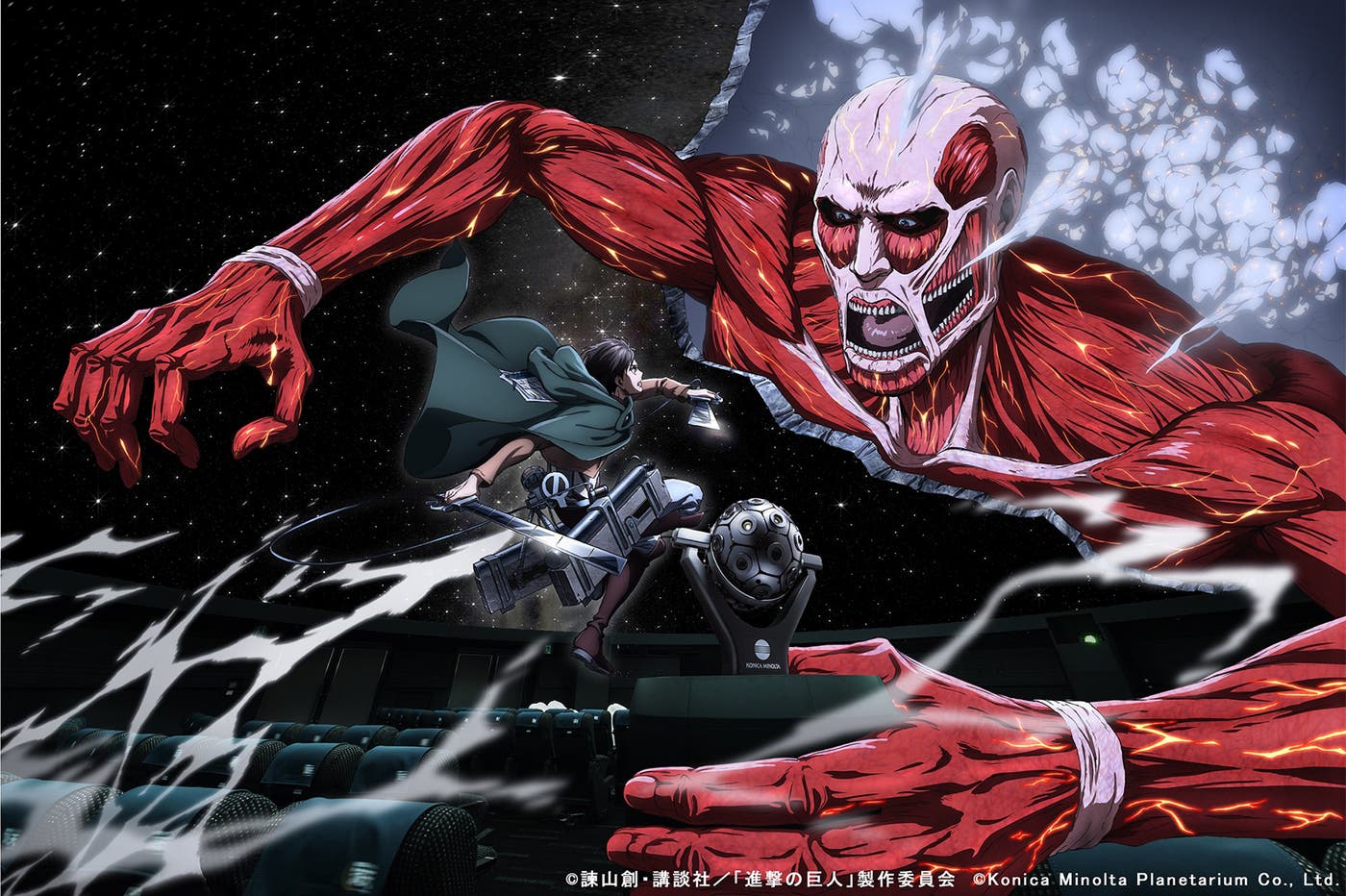 「コニカミノルタプラネタリウム“天空”」(東京・押上)と「プラネタリウム“満天”(東京・池袋)」では夏の新上映作品として「進撃の巨人 IN THE DOME -兵士たちの星空-」を、2017年5月20日(土)より“天空”で、5月27日(土)より“満天”で、それぞれ上映を開始する。