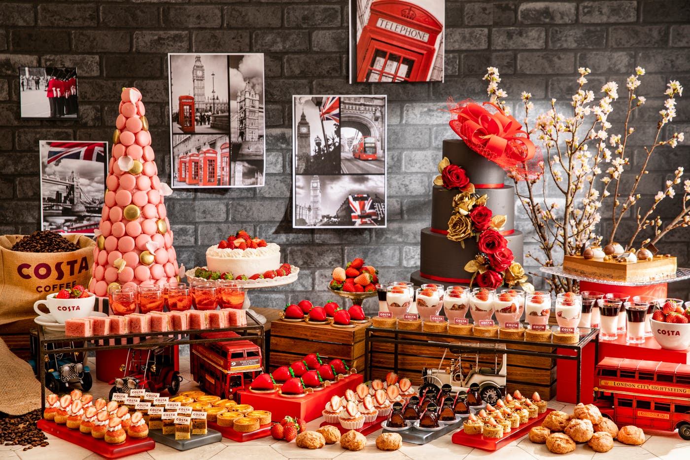 コンラッド東京では、ヨーロッパのカフェブランド「コスタコーヒー」とコラボレーションした「ロンドン・ミーツ・トウキョウ」スイーツビュッフェを、2022年3月19日(土)~5月15日(日)の土日祝日に開催する。