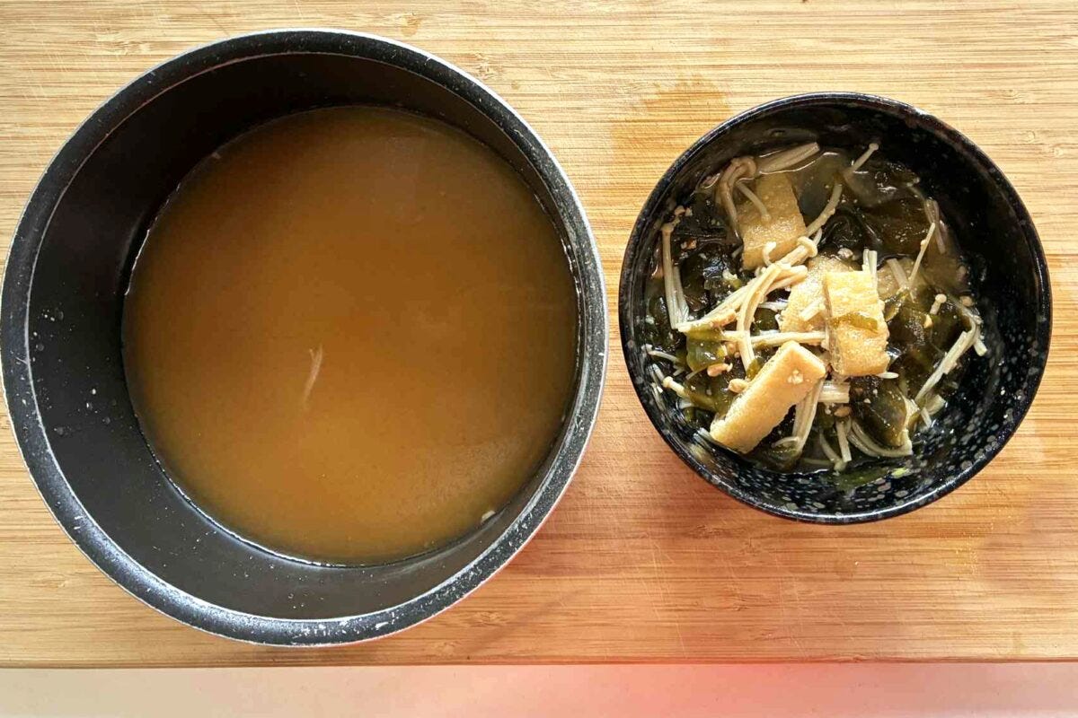 ・余ったみそ汁 油揚げ・わかめ・えのき (つゆ2合分の水分量)