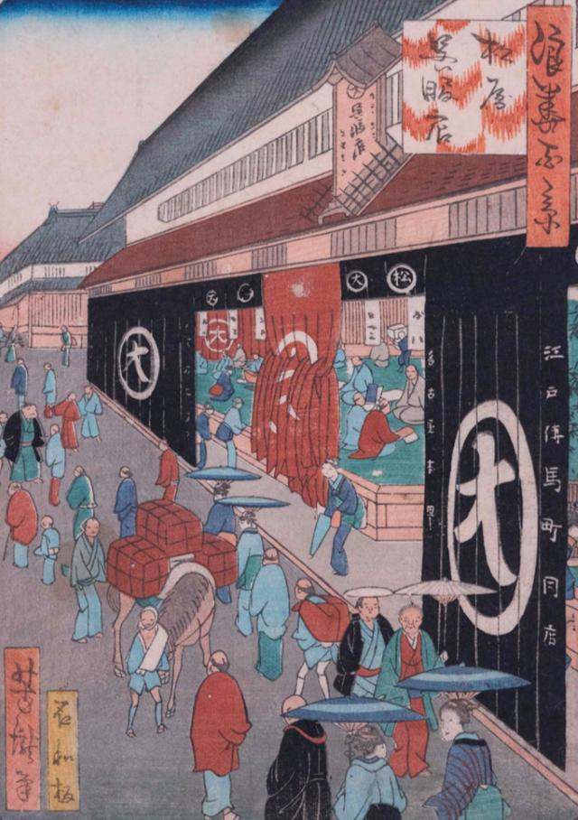 中井芳瀧「浪花百景 松屋呉服店」 1階から8階までを、スタンプラリーで回遊しながら楽しめる「歴史展リーフレット」も配布。スタンプを集めると、江戸末期の心斎橋店の浮世絵が完成するお楽しみも! 春休みに、親子で参加するのもよいですね。