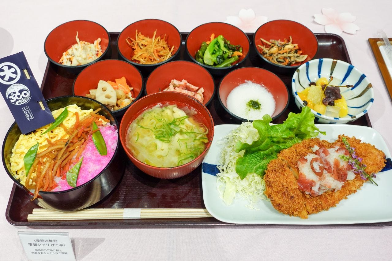 季節の贅沢 堺 銀シャリ げこ亭「春の彩り三色ご飯と梅香るおろしとんかつ御膳」