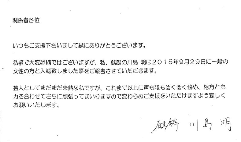 いつもご支援下さいまして誠にありがとうございます。私事で大変恐縮ではございますが、私、麒麟の川島 明は2015年9月29日に一般の女性の方と入籍致しました事をご報告させていただきます。