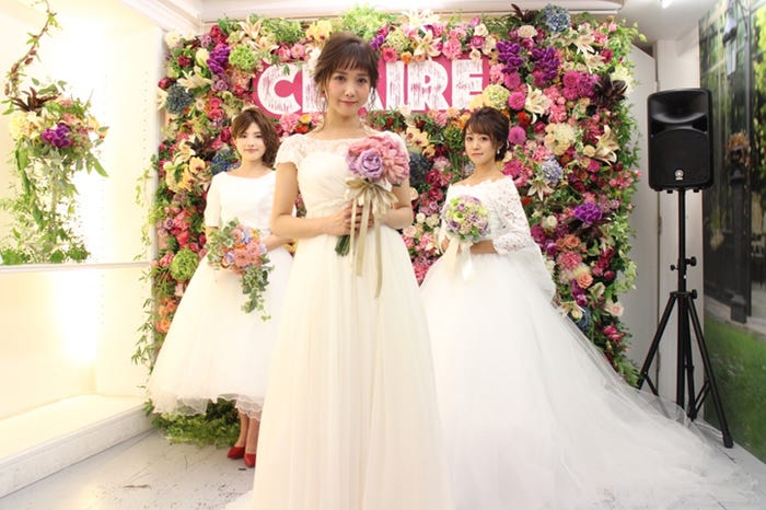エンパイアライン ドレス(画像中央:田中里奈さん着用)は「ガーデンウエディングをイメージしたデザインで、カジュアルなスタイル好きのオシャレな方に是非着てほしいドレスです。シンプルだけど、ベルトからレースが出てきたり、デコルテのレースも着脱することで、大人っぽい雰囲気となり、また違った印象で楽しんでいただけます」